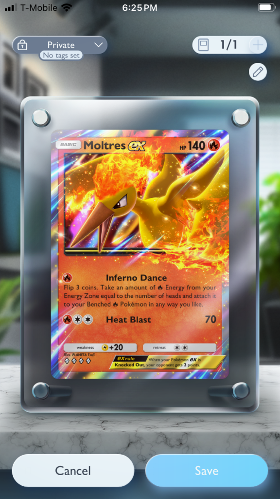 You can also show off your favorite cards. When you get duplicates, you can cash some in to get some special flare on your cards. I actually haven’t done this yet, so I’m not sure how cool it actually is. But you can also set up display cases. These have different backdrops that you can put a card in front of. I’m hoping that down the line there’s cases that can display multiple cards, like if you’d want to show off the Blastoise evolution line or something, but as of now, I only see ones for single cards.
