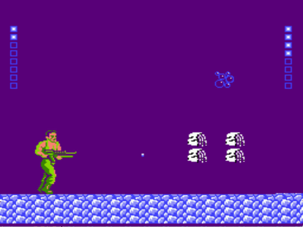 After you defeat him, you get a new type of level called “Big Mode”. Here, it’s no longer a platformer. Instead, you automatically walk to the right. Your sprite is considerably larger than it was in the main mode, thus “Big Mode”. All the random enemies have been replaced with… bubbles? They just kind fly across the screen until you shoot them. Once again, you encounter the Predator at the end of the level. This time, there’s multiple Predator heads that attack you, while the Predator himself is invisible unless you shoot him. So you’re just kind of shooting at nothing. Big Mode is the thing I remember most about this game from when I was a kid. It was just a really silly diversion from the main platforming.