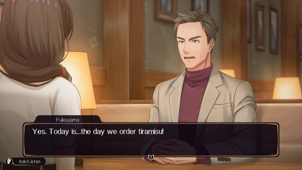 But this is a video game, not a movie, so what is it you’re actually doing? It’s a lot like other visual novels, like the Ace Attorney series, but without those games’ court sessions. You’re basically using a menu to go select different locations to go to and talk to different people. You can look around the screen with a curser and select things you want to look at. At the end of each chapter, you talk things out with your partner, Ayumi, which plays out like a quiz, which helps with making sure you’re keeping all the information straight.