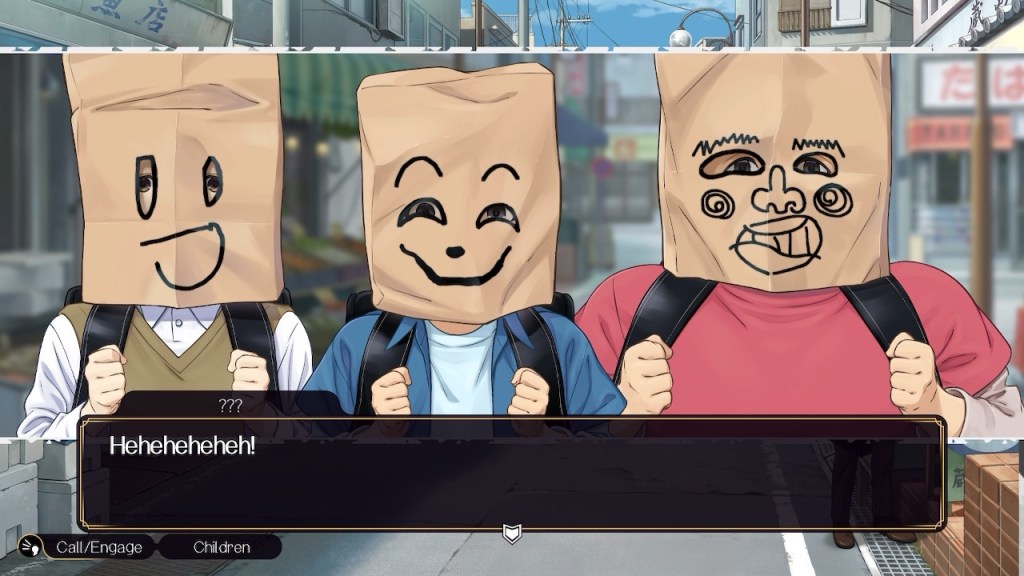 Without getting into spoilers, it’s the supporting cast that are the real draw in this story. There’s the main couple police detectives that you deal with, one who’s kind of goofy but has a heart of gold and the other who doesn’t want anything to do with you or your agency, but has a personal connection to the mystery at hand. There’s multiple people with connections to the victims with varying degrees of wanting to help you out. At one point, there’s a group of kids who are wearing paper bags and “playing Emio”. And then there’s the actual director of your agency who spends most of the game out of town, investigating the origins of the urban legend of Emio while you work on the current case. All of these characters come together to make a really charming game, even when it gets into very dark territory.