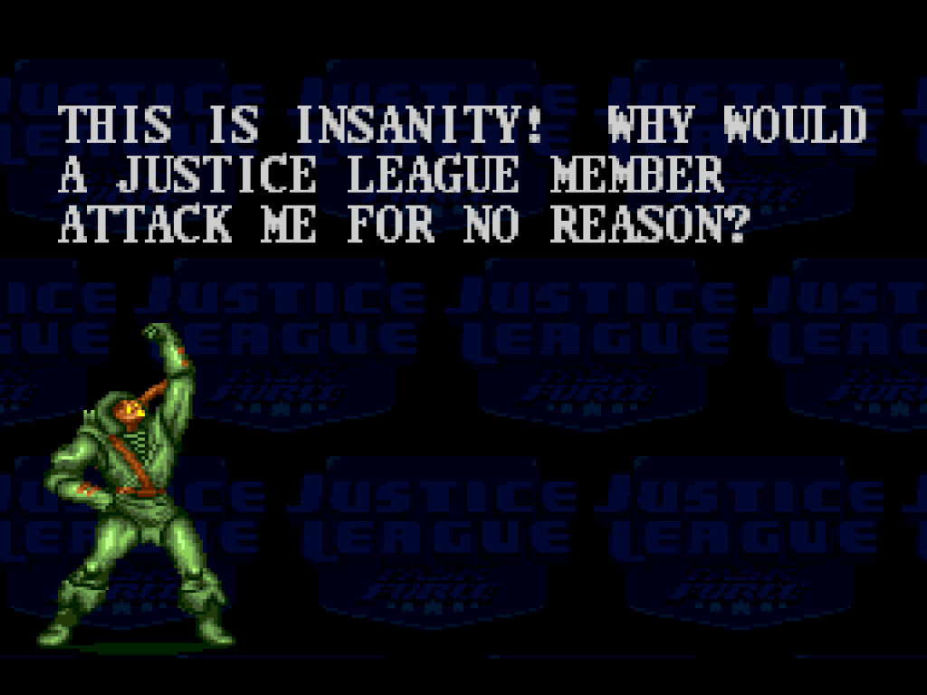 But let’s start with the positive. Justic League Task Force is one of the few fighting games from this era with a true story mode in it. We see it all the time now, especially after the positive reception to Mortal Kombat (9)’s story mode, but back then, you mostly just got an arcade mode and a versus mode. There’s not a whole lot to the story though. You pick one of the members of the Justice League (the game features playable villains too, but not in the story mode) and see a little bit of dialogue between standard fighting game fights. The story revolves around Darkseid taking over the earth with doppelganger versions of the good guys, which is how they explain having to fight other heroes. In a nice detail, when you beat one of the fake heroes, they explode like a robot, whereas when you defeat a villain, they just fall down.