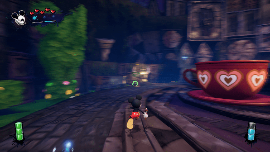 The game has a very sharp look. The world Mickey finds himself in is distinctly Disney, but also broken down and falling apart. That’s not to say that it’s a particularly dark or mature looking game, just a world in need of getting fixed up. There’s also cutscenes with a 2D hand drawn look that I think looks great and keeps a cartoony feel.