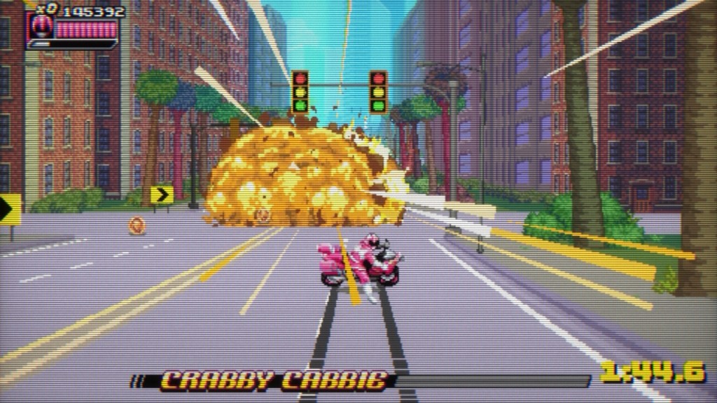 The fighting is about what you’d expect, but it gets the job done. You can run, punch, double jump, jump kick, and dodge, which all feels nice and snappy. Sometimes there will be things in the environment, like signs or explosive barrels, that you can knock into your enemies for some fun extra damage. Like I said, if you’ve played a beat ‘em up, you know what this is. But despite the familiarity of it, I had a great time punching Putties and Tangas through all the levels.