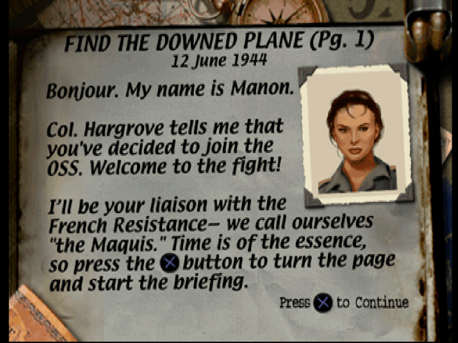 At this point, the game really reminded me of what era it came out in. You get a mission briefing from a member of the French resistance, that tells you what’s going on and what your objectives are. This is extremely GoldenEye-like. Also just like GoldenEye, you’re not simply running through levels, shooting everything and seeing cool set pieces. Instead, you have to explore the levels to complete objectives. The first mission tasks you with finding a log book, a plane, and then entering a village. It’s nothing too complicated, but it does make you think a little bit about what you’re doing.