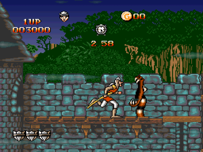 The simple answer is, you don’t. Today, I’m looking at Dragon’s Lair for the Super Nintendo, a game that does not resemble the arcade game at all. Sure, it follows the same plot. You play as knight Dirk the Daring on his quest to save Princess Daphne from the titular Dragon’s Lair. But this isn’t an interactive cartoon at all. Instead, it’s a pretty basic platformer.