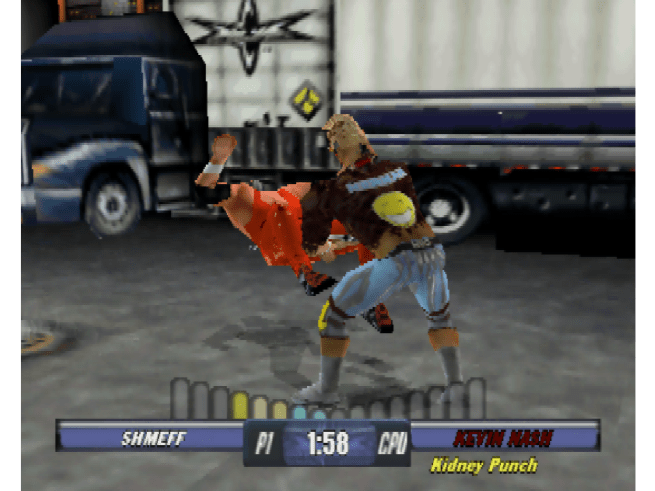 Much like the other wrestling games that I have played before, this game is one of the few that is controlled with a D pad on the N64. You can do various attacks with the C buttons and grabble your opponent with the B button. There’s also more complicated maneuvers that I didn’t quite figure out, like reversals, but I found that mostly just flaying about worked alright. There’s also weapons scattered about the ground, which you can pick up and smack your opponent with. After beating the stuffing out of Doug Dillinger for a while, I held down the L button, pinned him, and won the match.