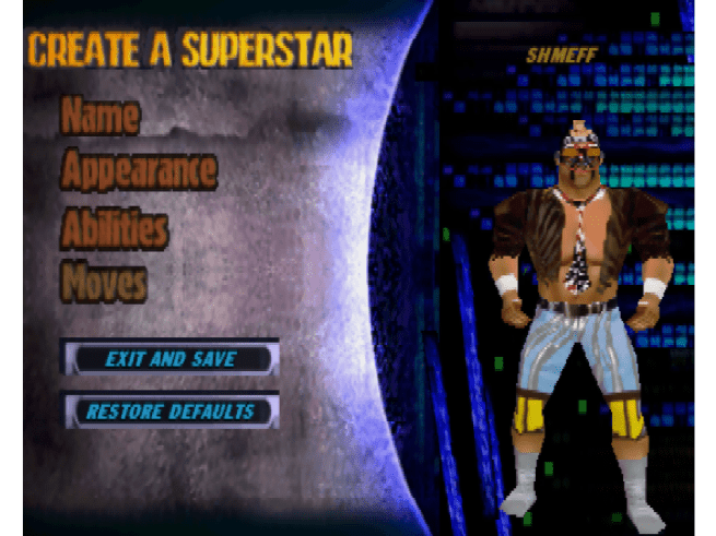 I figured before I ended my time with the game, I should check out the create a wrestler mode. You start by selecting a wrestler to be your template. I went with Jeff Jarret and named him Shmeff. Then you get all sorts of options, from faces to clothes to tattoos. I just fiddled with a bunch of options until I made Shmeff pretty ugly. You then have options to adjust stats and choose moves. I didn’t go to deeply into this, because it’s not like I’m going to play too much more. After finishing, I had Shmeff fight Jeff Jarrett and won again.