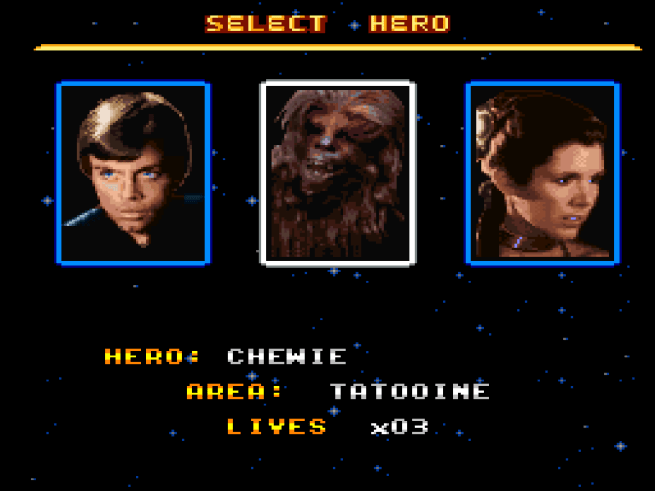 When you get to the more standard platformer levels, you get a choice of who to play as. In the first couple levels, your choices are Luke, Leia, and Chewbacca. Luke has his lightsaber and force abilities. Chewbacca has his Bowcaster, allowing you to blast enemies from a distance. Leia is in her disguise as the bounty hunter Boushh and has a staff. She really just seems like a worse Luke and I’m not sure why you’d pick her, other than it’s pretty cool to play as Leia in an action game.