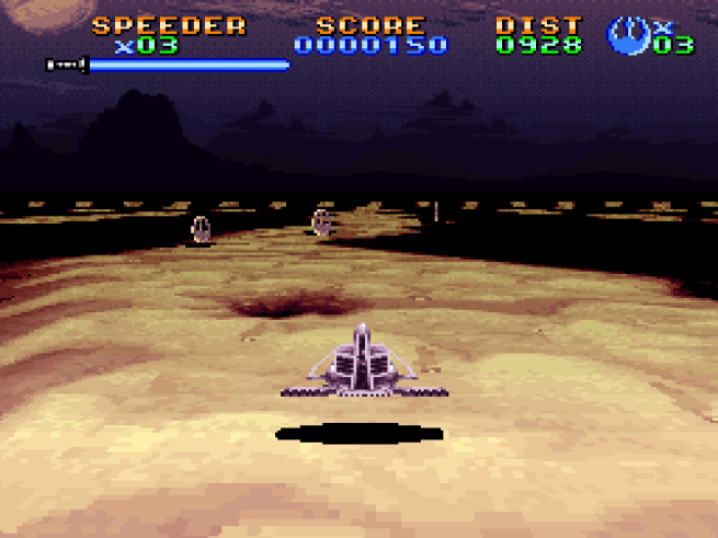 Speaking of that speeder, the game features several vehicle levels. These are the classic, Super Nintendo Mode 7 sections, reminiscent of games like Super Mario Kart and F-Zero. These help break up the action, and they do look pretty impressive. That being said, compared to the early ones in the other two games, which include shooting Jawas on the way to their Sandcrawler in the first game and taking out AT-ATs in a Snowspeeder on Hoth in the second, this first speeder level is pretty lame. It’s just cruising along a slim path, avoiding rocks and jumping over cliffs. My memory of the later ones are more positive, but I didn’t play them for this post.