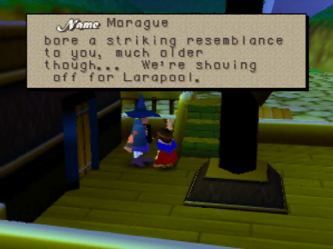 At the dock, there’s a boat and another inn. Once again, we find our good friend Shannon, Is she just going to be at every inn? She talks about going to the kingdom of Larapool, so I’m assuming that that’s what we’re up to to. I save my game and head to the boat. The captain comments that someone who looked just like me been on the boat recently. Oh right, I was looking for my dad! After walking below deck, uh, nothing happens. I turn around and head back above deck and find that we’ve apparently arrived. No fake shaking around or text box to imply that the boat was moving, we’re just here. The captain explains that the wind has stopped, so we’re not going to be able to sail any time soon.