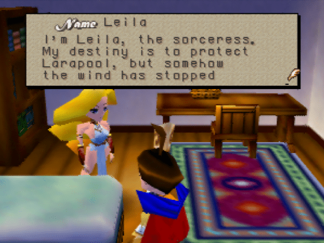 I move through yet another new field area until I reach Larapool. It’s a pretty impressive town, with several bridges leading to different buildings. The important thing is going to the inn, again, and talking to Shannon. She also talks about how the wind has stopped and that we’ll need to recover the wind orb to fix things. This inn is pretty big, and I decide to go upstairs. There, I find a tall blonde woman named Leila. She explains that demons have escaped, apparently because of the wind stopping. She says that she, like Brian, is a magician. She will be using her powers to protect Larapool, but Brian is going to have to help everywhere else. Wow, thanks.